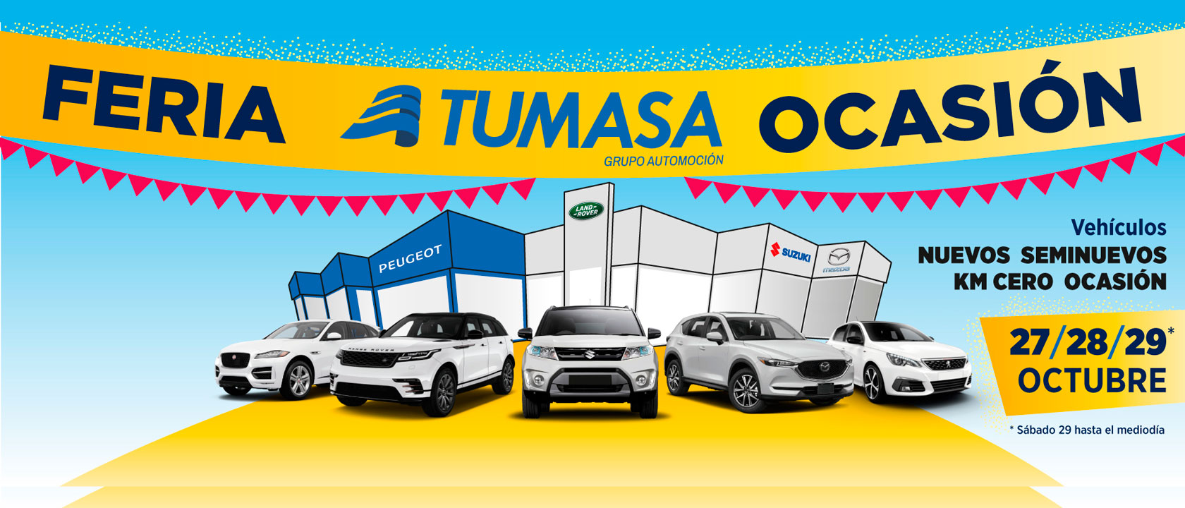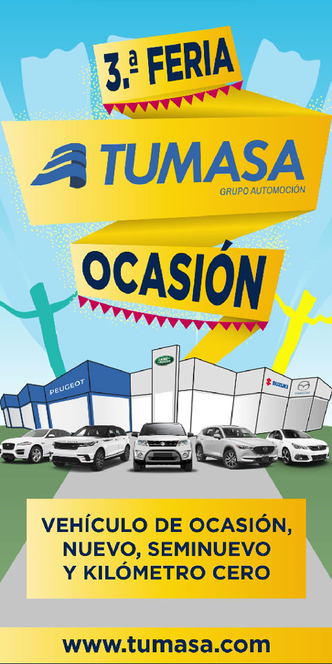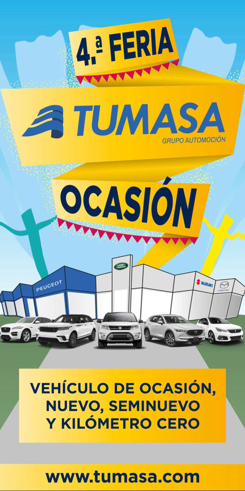 Cartel de la Feria Tumasa Ocasión con vehículos de ocasión de las marcas Peugeot, Mazda, Suzuki y Jaguar Land Rover
