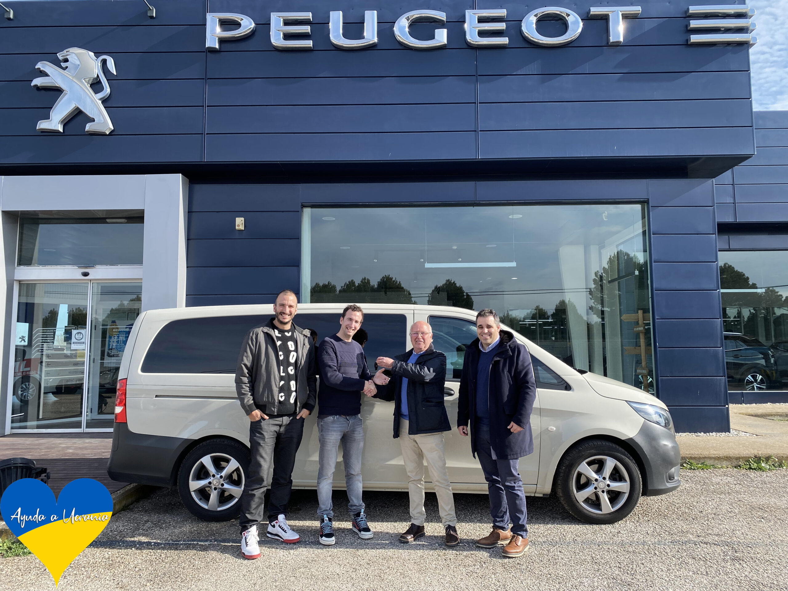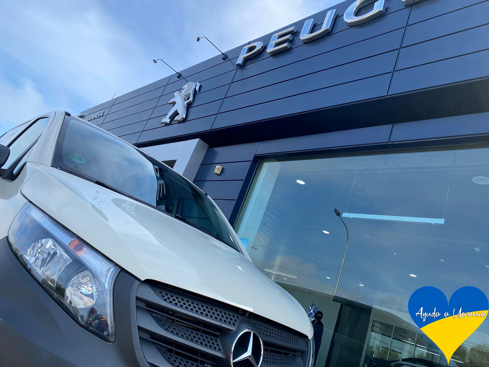 La furgoneta de Pirineos Rent a Car solidaria frente a la fachada de Tumasa, concesionario oficial Peugeot en Huesca y Monzón – Imagen de la iniciativa solidaria para recoger refugiados ucranianos y llevar los donativos solidarios de comida, ropa y medicamentos de los trabajadores de Tumasa. Acción solidaria de Huesca a Cracovia (Ucrania)