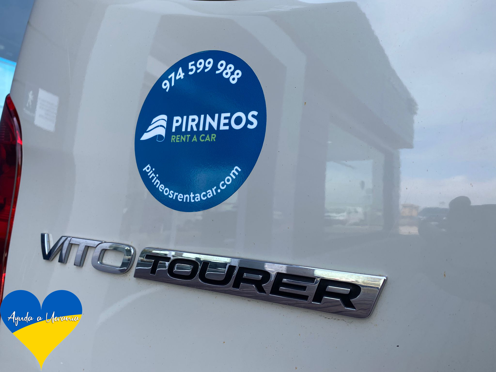 Imagen de la furgoneta de Pirineos Rent a Car solidaria de 9 plazas y el logo del rent a car
