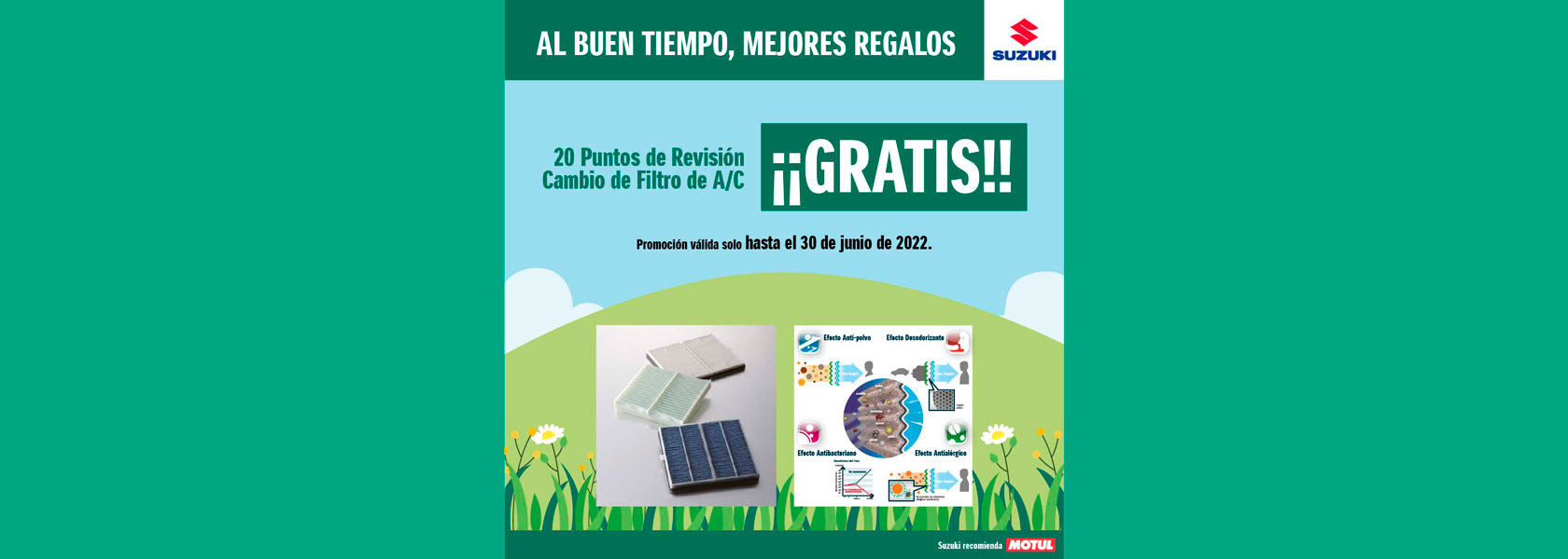 Campaña Suzuki Postventa Primavera 2022. Cambio de filtro de polen gratis con la inspección gratuita de verano en tu servicio oficial Suzuki en Huesca y Monzón